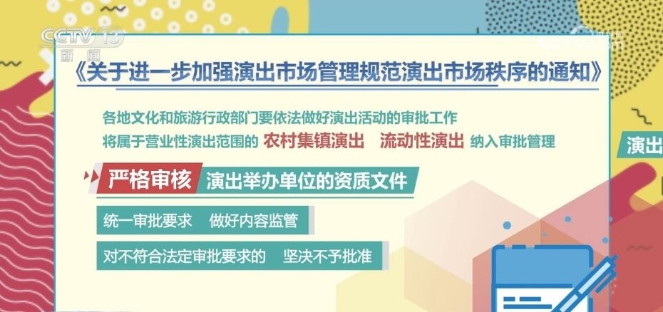 通知指出,各地文化和旅游行政部門要依法做好演出活動(dòng)的審批工作,將屬于營(yíng)業(yè)性演出范圍的農(nóng)村集鎮(zhèn)演出、流動(dòng)性演出納入審批管理,嚴(yán)格審核演出舉辦單位的資質(zhì)文件,統(tǒng)一審批要求,做好內(nèi)容監(jiān)管。對(duì)不符合法定審批要求的,堅(jiān)決不予批準(zhǔn)。文化和旅游行政部門要定期對(duì)演出場(chǎng)所進(jìn)行檢查,督促演出場(chǎng)所定期開(kāi)展設(shè)施設(shè)備檢查,落實(shí)安全生產(chǎn)責(zé)任制。督促演出場(chǎng)所建立完善現(xiàn)場(chǎng)巡查制度,指定專人負(fù)責(zé)演出活動(dòng)的巡查,做好現(xiàn)場(chǎng)觀眾管理,堅(jiān)決防止擁擠、踩踏等事故發(fā)生,確保演出現(xiàn)場(chǎng)安全。各地文化和旅游行政部門要將社會(huì)關(guān)注度高、票務(wù)供需緊張的營(yíng)業(yè)性演出作為重點(diǎn)監(jiān)管對(duì)象,提前進(jìn)行研判。督促演出舉辦單位、演出票務(wù)經(jīng)營(yíng)單位面向市場(chǎng)公開(kāi)銷售的營(yíng)業(yè)性演出門票數(shù)量,不得低于核準(zhǔn)觀眾數(shù)量的70%。對(duì)在票務(wù)經(jīng)營(yíng)中發(fā)現(xiàn)有炒票問(wèn)題或可能造成不良影響的,應(yīng)當(dāng)及時(shí)約談演出舉辦單位和演出票務(wù)經(jīng)營(yíng)單位,督促整改。要聯(lián)合屬地公安、市場(chǎng)監(jiān)管等部門,依法打擊“黃?!背雌?、虛假宣傳等違法違規(guī)行為,切實(shí)保障消費(fèi)者合法權(quán)益。