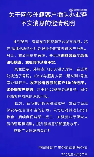 ·深圳移動否認“外籍客戶插隊”:調(diào)錄像核查,發(fā)布投訴視頻的客戶晚到。