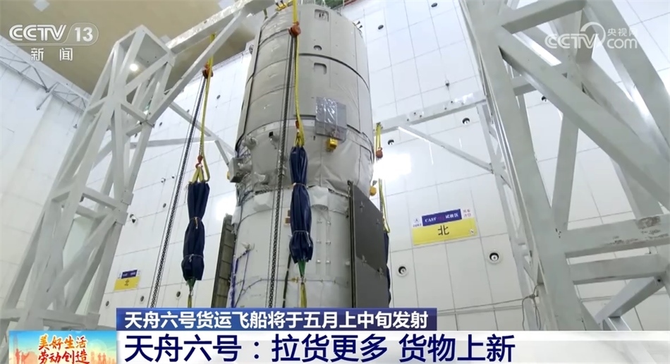 總臺央視記者 陶嘉樹:在我身后的就是天舟貨運飛船,它整個的長度是10.6米,整體分成兩個部分,下面比較小的這一部分是它的推進艙,上面比較大的部分是它的貨物艙。天舟貨運飛船總重13.5噸,從天舟六號開始,它的載貨量從以前的6.9噸提高到了7.4噸,是目前世界上運貨能力最強的貨運飛船之一。