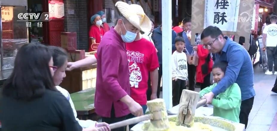 在這條街區(qū),你還可以找到各種陜西特色美食的身影。這種色澤金黃的美食叫陜北小米酥,現(xiàn)場(chǎng)制作,入口酥脆。這個(gè)“五一”假期,很多游客一路逛一路吃,走的時(shí)候還會(huì)給家里人帶上幾盒。