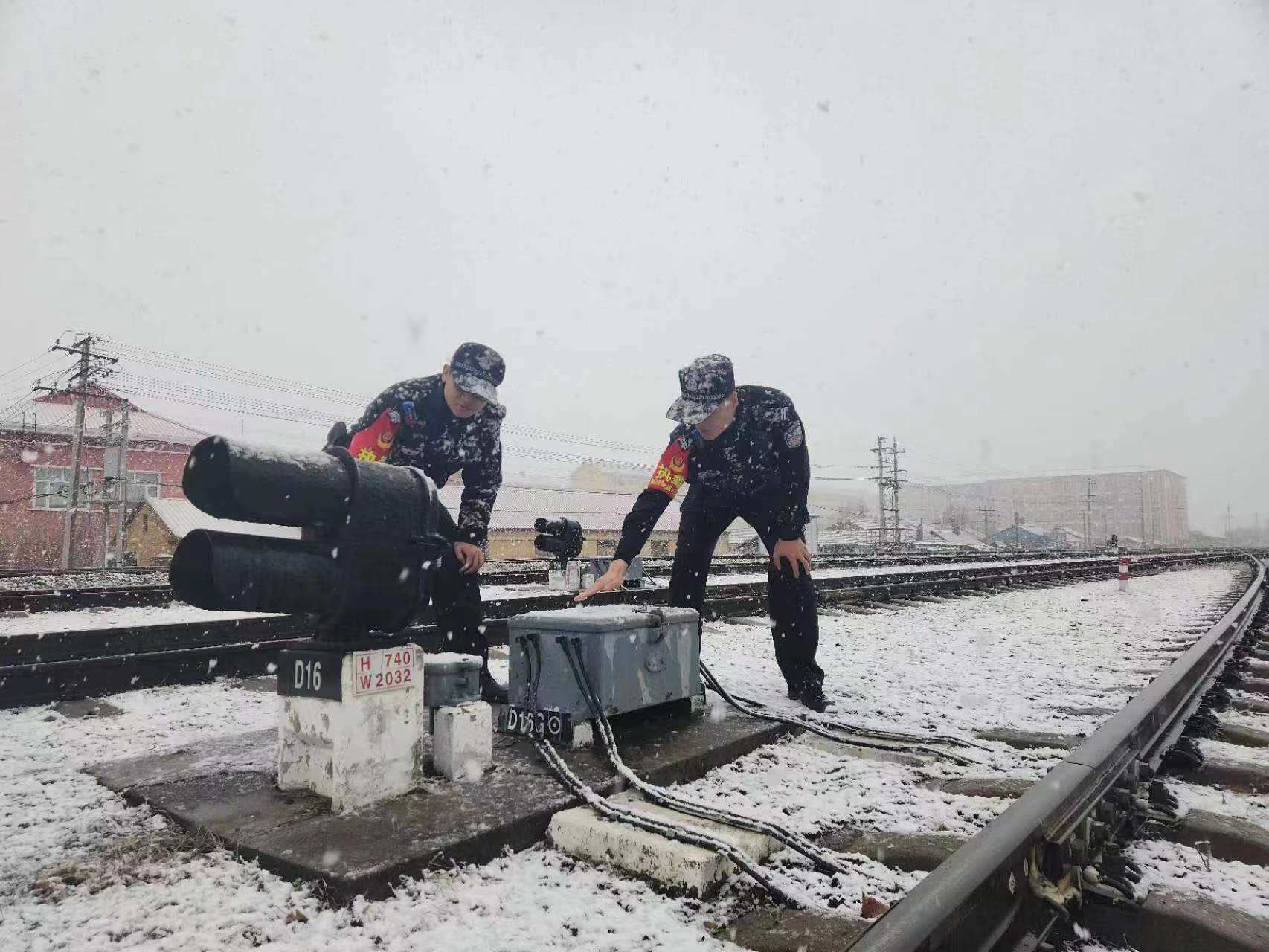 2023年4月30日,內(nèi)蒙古自治區(qū)根河市,海拉爾鐵路公安處根河站派出所民警在風(fēng)雪中巡邏。五一假期,位于大興安嶺深處的根河市迎來降雪天氣,根河站派出所民警在風(fēng)雪中堅(jiān)守工作崗位,確保旅客出行安全。 張磊 攝