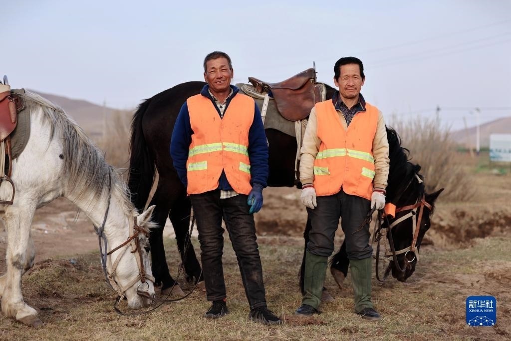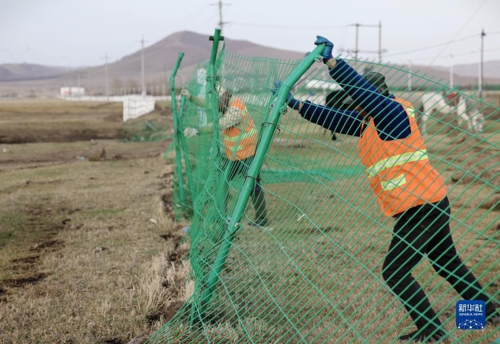 5月2日,河北省承德市豐寧滿族自治縣大灘鎮(zhèn)扎拉營村的護林員趙世海(右)和羅金寶在海留圖國家濕地公園修復護欄。   新華社記者 邢廣利 攝