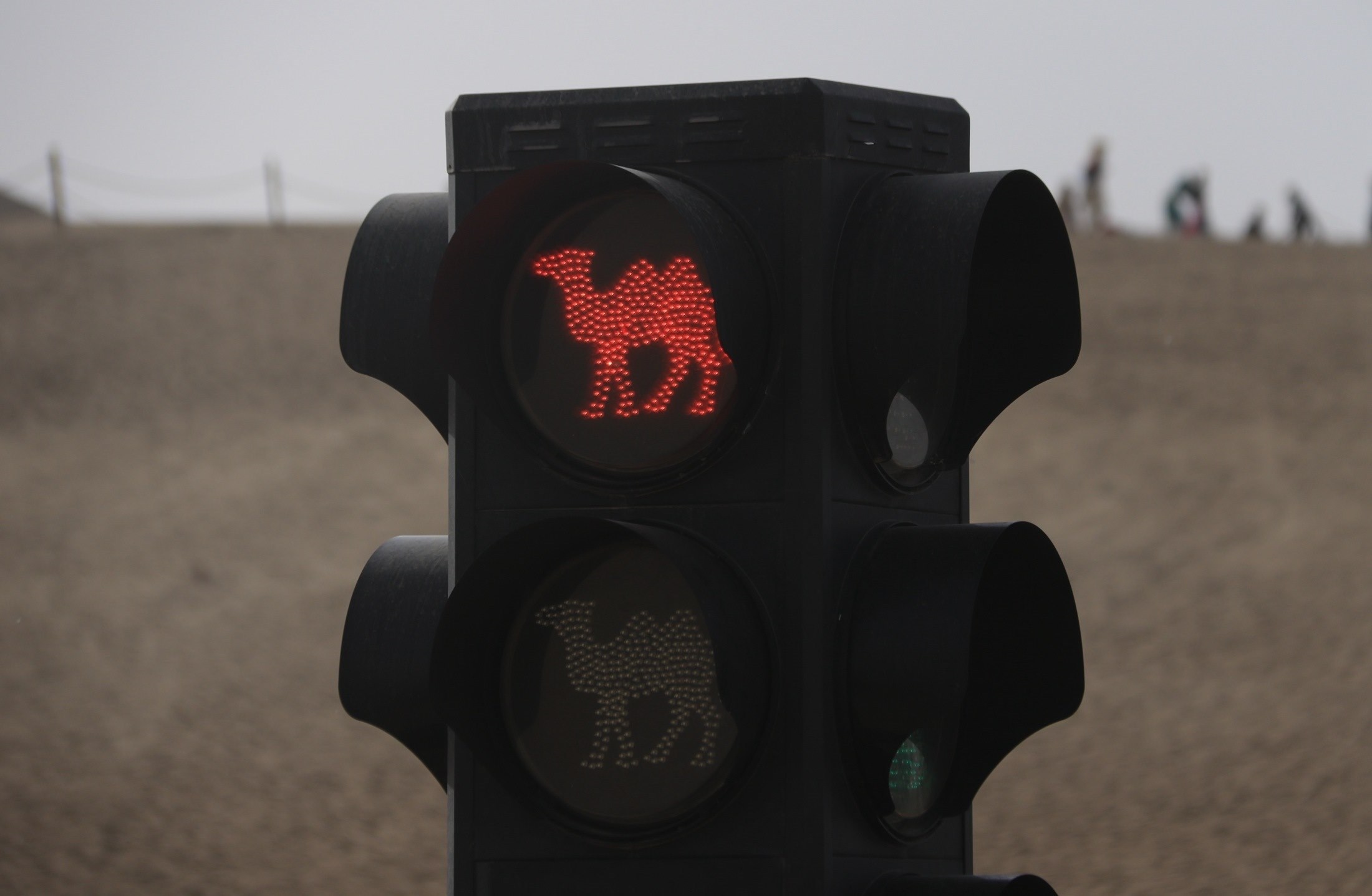 2023年5月1日,甘肅酒泉,敦煌市鳴沙山月牙泉景區(qū),具有駱駝元素的交通信號(hào)燈。