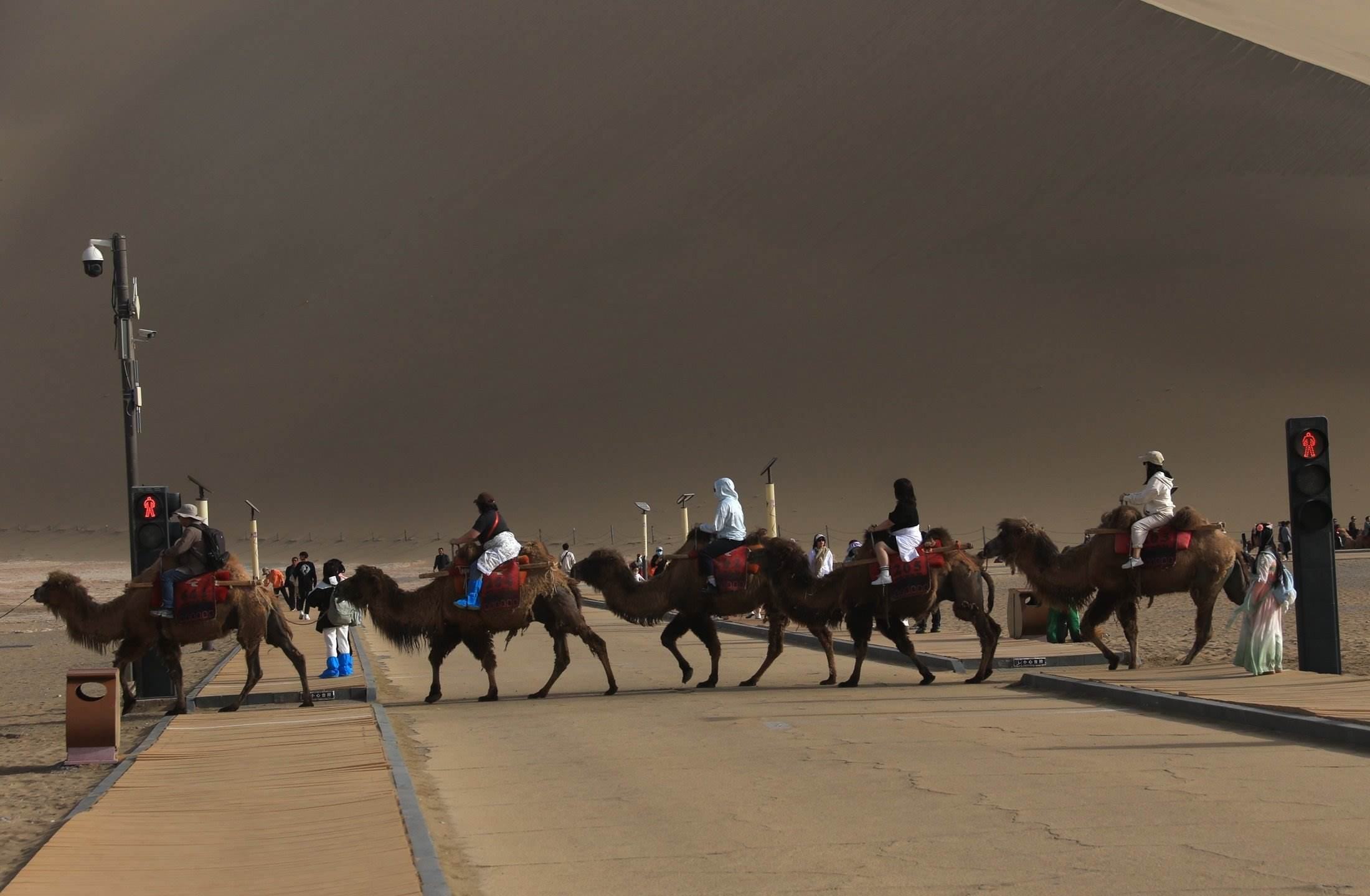 “五一”假期,甘肅省敦煌市鳴沙山月牙泉景區(qū)迎來旅游高峰。設(shè)置在該景區(qū)內(nèi)行人步道和駱駝通道兩個(gè)交叉點(diǎn)的“駱駝紅綠燈”,引導(dǎo)人、車和駱駝?dòng)行蚍至鳎粌H確保了景區(qū)交通安全暢通,也成為景區(qū)內(nèi)的“網(wǎng)紅打卡點(diǎn)”之一 。