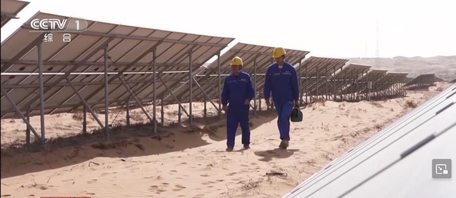 央視網(wǎng)消息:在寧夏中衛(wèi)市騰格里沙漠里,成千上萬塊藍色光伏板整齊排列,隨著太陽的運轉(zhuǎn)逐日追光,每年可以發(fā)電17億度。這里的工作人員被稱為“追日人”?!拔逡弧奔倨?,他們依然堅守在工作崗位上。