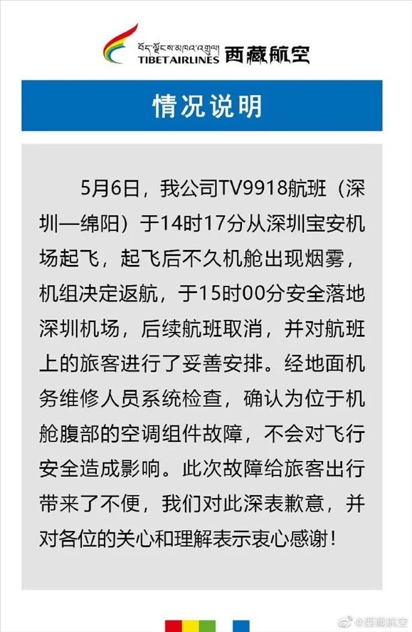 ·西藏航空回應(yīng)飛機內(nèi)出現(xiàn)濃煙返航:空調(diào)組件故障。