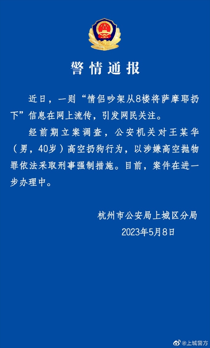 ·情侶吵架從8樓將薩摩耶扔下,杭州警方:男子被采取刑事強制措施。
