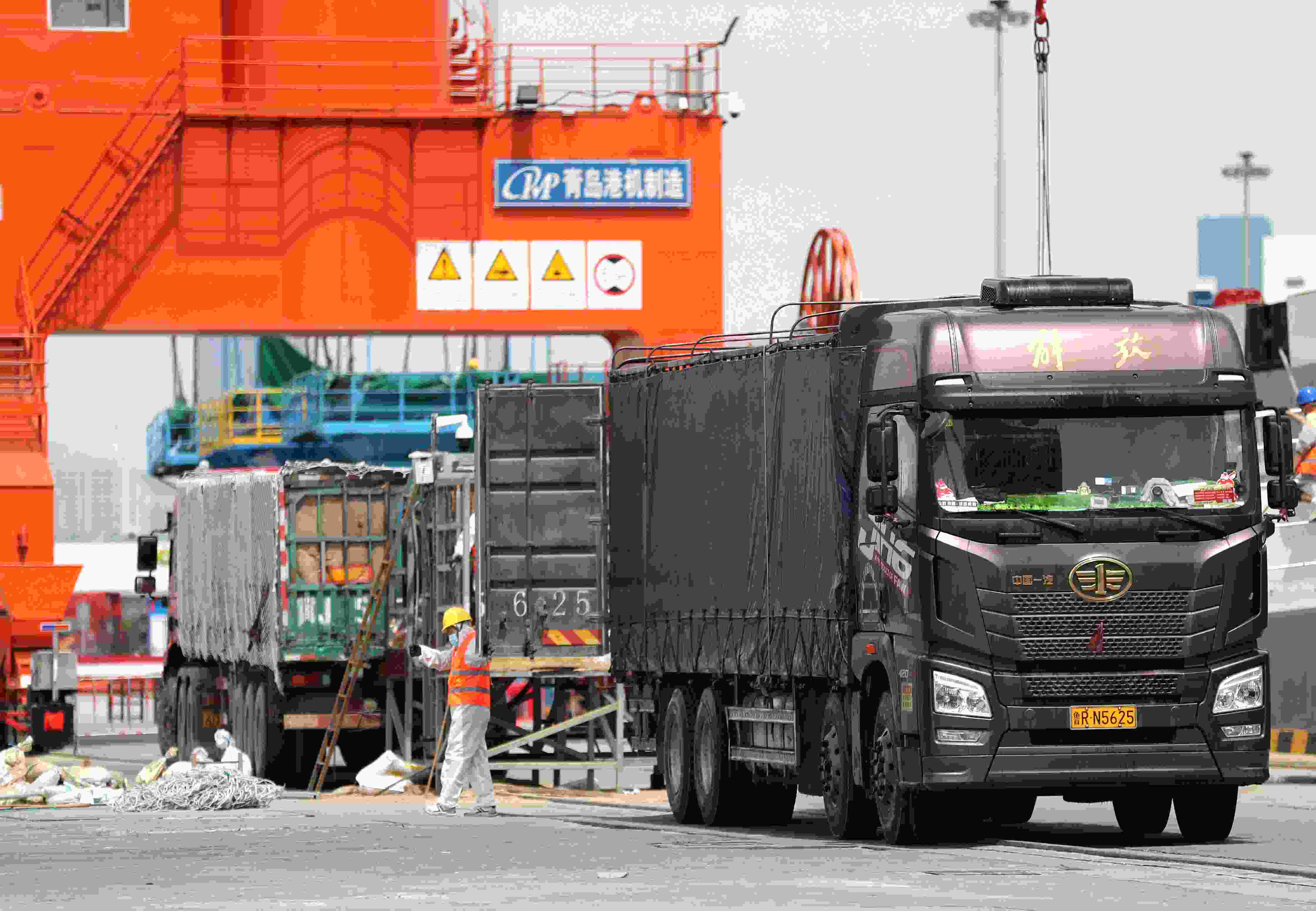 5月8日,在山東港口青島港前灣集裝箱碼頭,3000余頭活牛卸船轉(zhuǎn)運(yùn)。