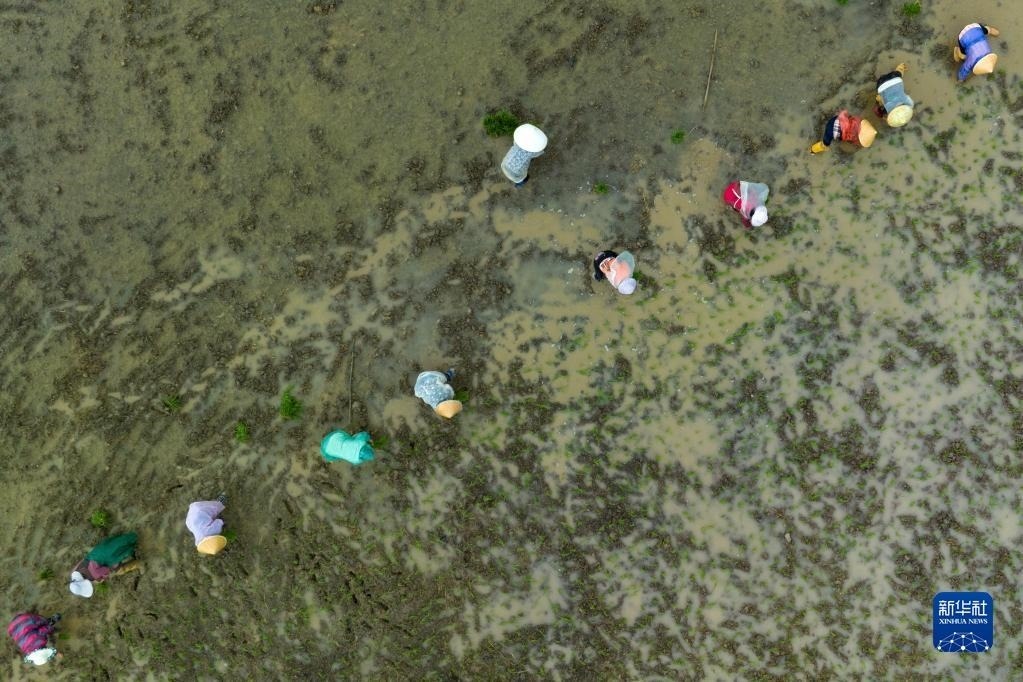 5月9日,在四川省崇州市道明鎮(zhèn)協(xié)和社區(qū),農(nóng)民在一片高標(biāo)準(zhǔn)農(nóng)田里種植水稻(無人機(jī)照片)。