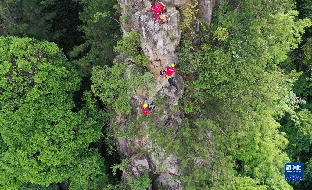 5月14日,張家界市武陵源區(qū)山地應(yīng)急救援隊(duì)隊(duì)員在天子山的絕壁間索降。   新華社發(fā)(吳勇兵攝)