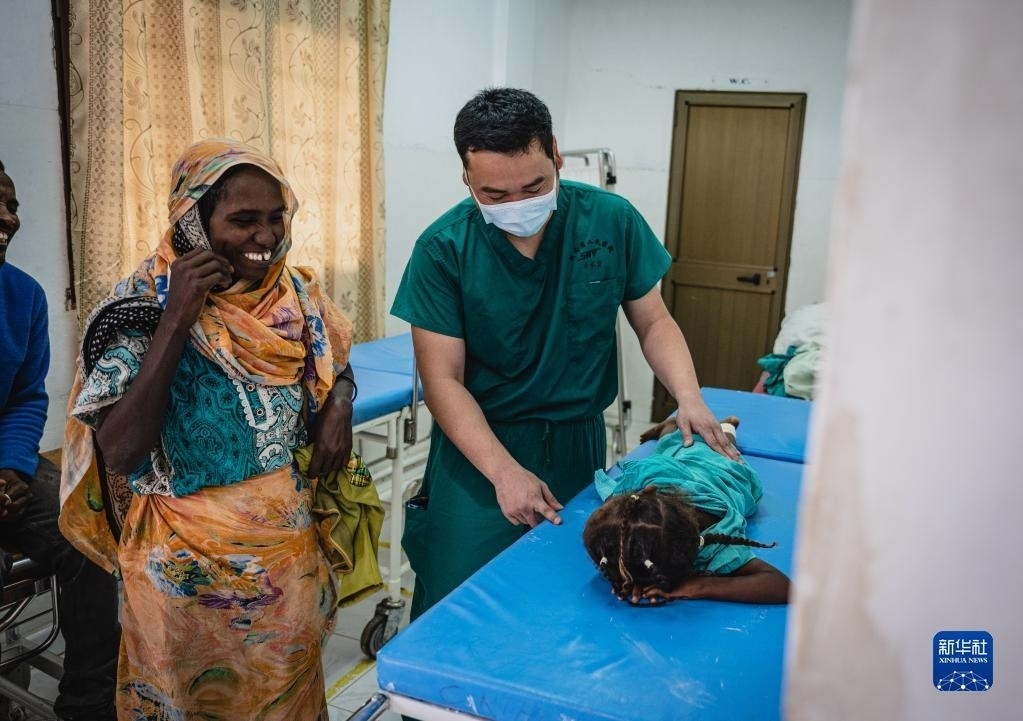 5月9日,在厄立特里亞首都阿斯馬拉的哈利貝特醫(yī)院,醫(yī)療隊脊柱外科醫(yī)生周大凱(中)為患者做檢查。
