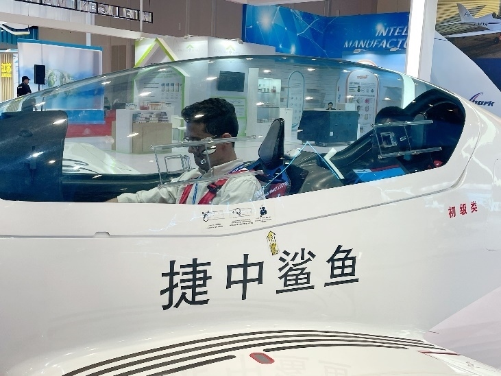 采訪(fǎng)團(tuán)成員在展會(huì)體驗(yàn)“鯊魚(yú)飛機(jī)”