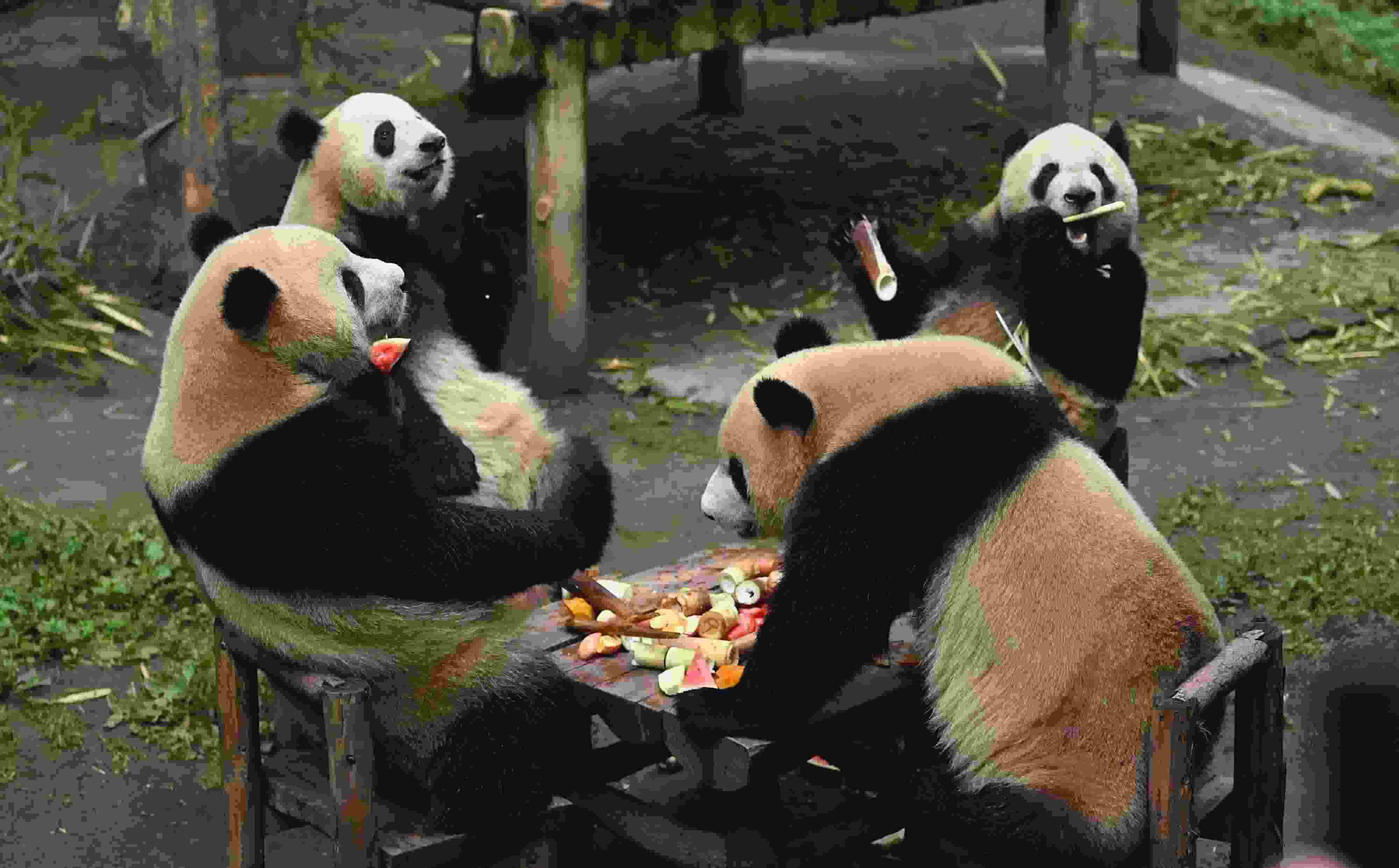 2023年5月21日,在重慶動物園內(nèi),大熊貓圍桌而坐,享用美食,萌態(tài)十足。 視覺中國