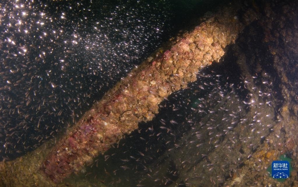 這是在蜈支洲島海域海洋牧場沉船魚礁內(nèi)拍攝的魚群(5月16日攝)。   新華社記者 楊冠宇 攝