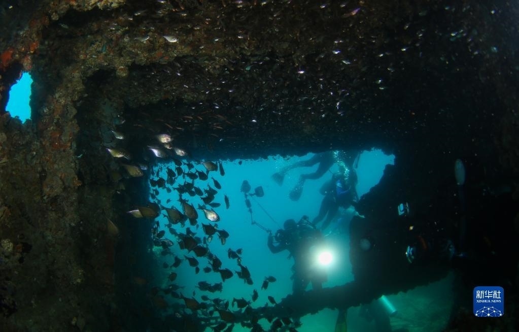 攝影愛好者在蜈支洲島海域海洋牧場拍攝沉船魚礁內(nèi)的魚群(2021年5月21日攝)。   新華社記者 楊冠宇 攝