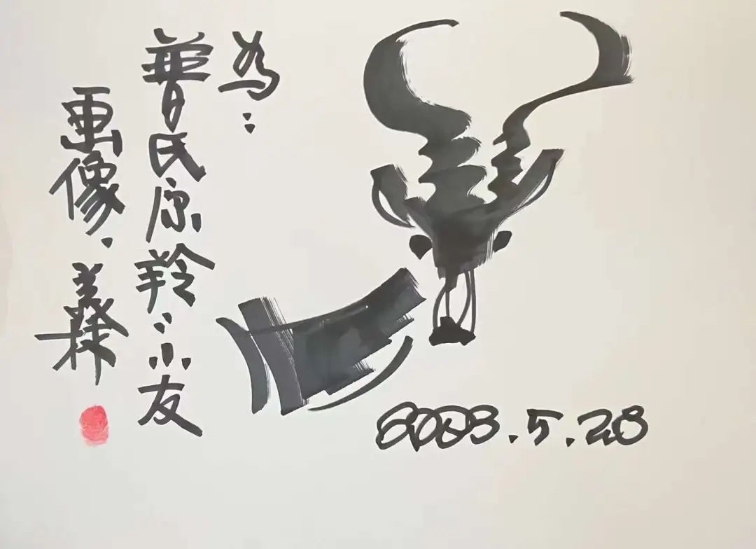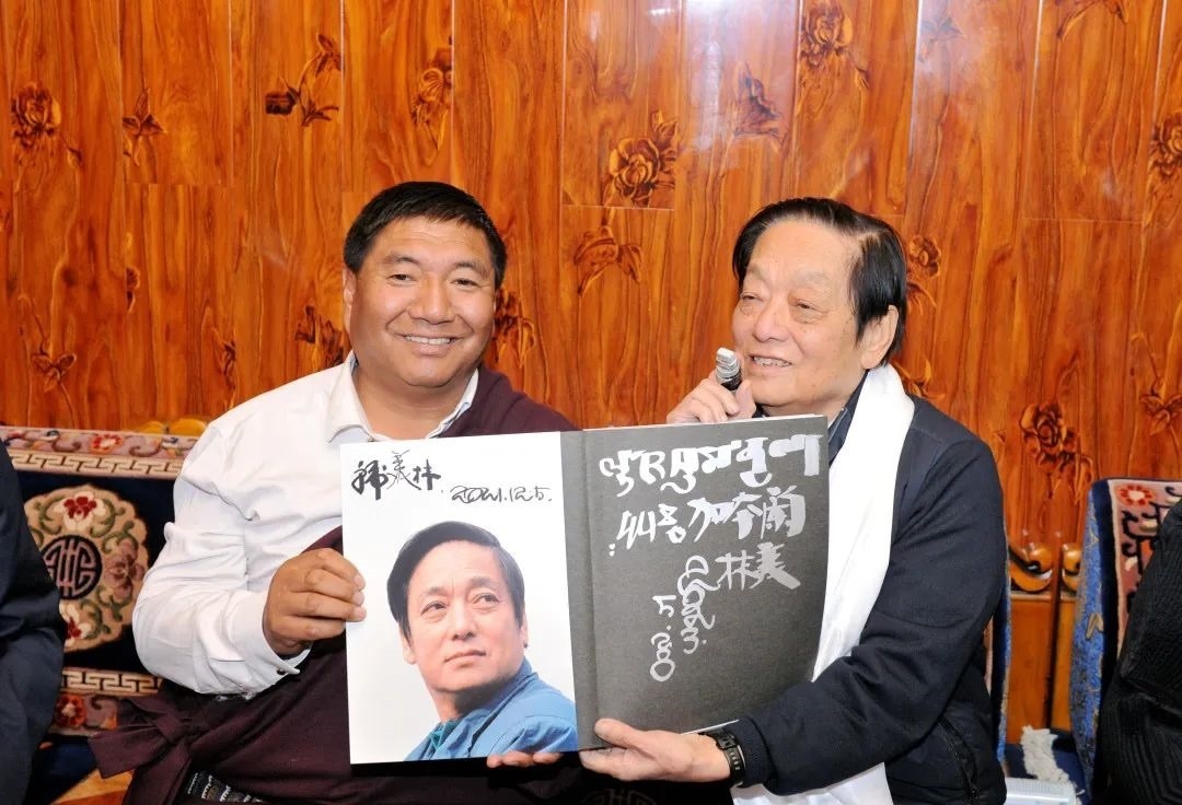 ▲韓美林為原青海省第十二屆人大常委會黨組副書記,現(xiàn)三江源生態(tài)保護(hù)基金會理事長鄧本太簽書留念