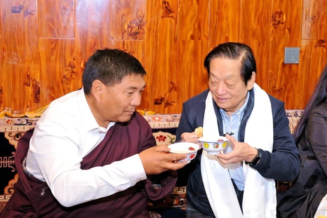 潔白的哈達(dá)、香氣撲鼻的奶茶和軟糯的糌粑,無不讓一行人從心底升騰起暖意和感動。韓美林用藏文簽下他們的名字將畫冊送給二人,韓美林說:“我是畫畫的,也許你們對藝術(shù)創(chuàng)作并不熟悉,但我得感謝你們,沒有你們世世代代守衛(wèi)著這片土地上的生命美好,我們的一切創(chuàng)作源泉都無從談起,說到對自然的理解,對生命的尊敬,對傳統(tǒng)的延續(xù),所有人都得向你們學(xué)習(xí)?!蹦撩穹驄D雖然漢語沒有那么流利,但看著畫冊里精美的作品,愛不釋手,并為韓老師能寫如此準(zhǔn)確美麗的藏文而驚訝,直到臨別還不停地用送上哈達(dá)的手勢為藝術(shù)大篷車祝福。