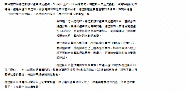 這兩天,譚主發(fā)現(xiàn)臺(tái)灣中時(shí)新聞網(wǎng)刊發(fā)了一篇快評(píng)文章:《特拉斯悄悄走了》。文章說到:特拉斯來臺(tái)沒有給臺(tái)灣帶來任何實(shí)質(zhì)利益,除了讓民進(jìn)黨當(dāng)局又做了一次毫無意義的大內(nèi)宣,什么也沒有留下。