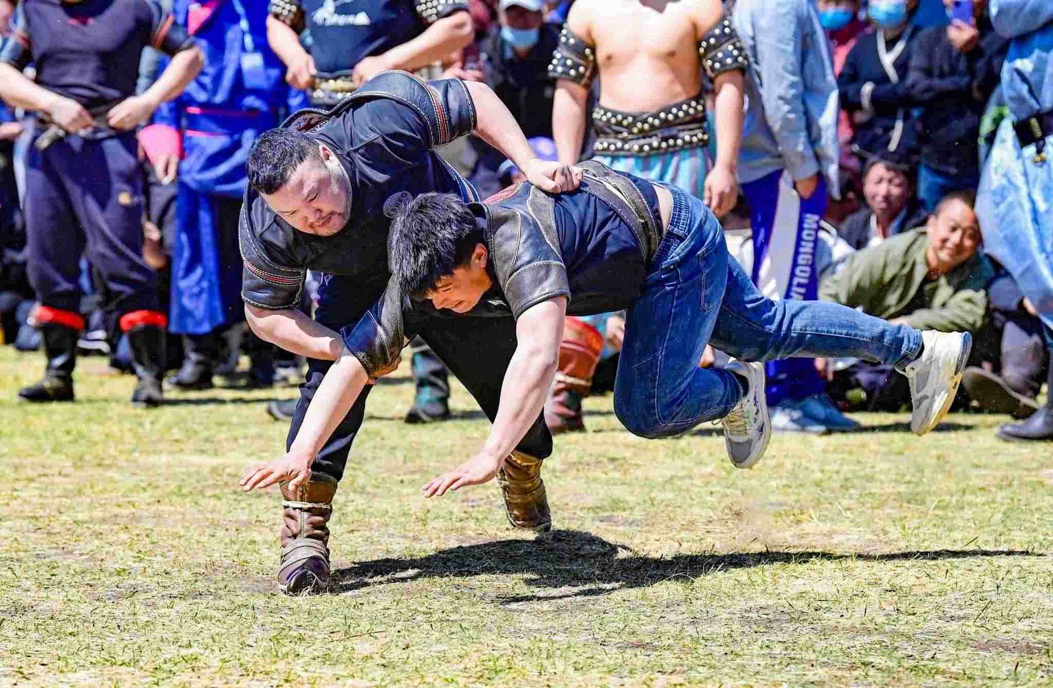 2023年5月26日,內(nèi)蒙古興安盟,科爾沁右翼前旗德伯斯鎮(zhèn)阿日林一合嘎查舉行首屆那達(dá)慕,設(shè)置的賽馬、布魯、搏克、拔河等傳統(tǒng)體育娛樂項(xiàng)目,吸引嘎查周邊500余名牧民參加比賽,喜慶牧業(yè)豐收季。視覺中國(guó)