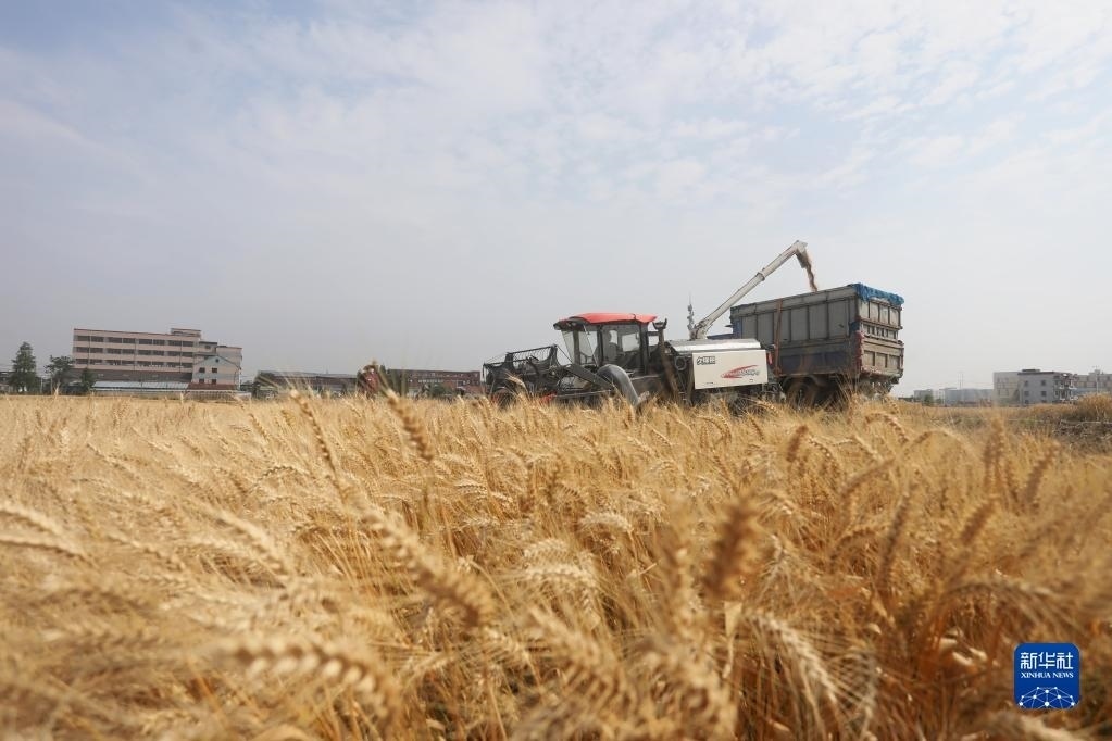 在浙江省嘉興市南湖區(qū)余新鎮(zhèn)金星村一片麥田里,農(nóng)民駕駛農(nóng)機收割小麥(5月26日攝)。   新華社發(fā)(金鵬 攝)