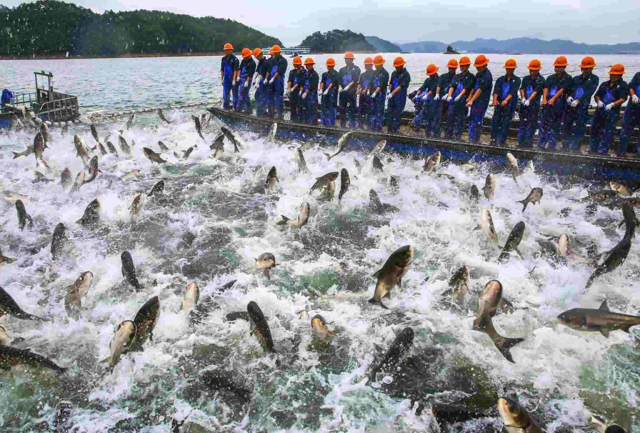 2023年5月31日,杭州,淳安縣千島湖小金山水域再現(xiàn)“巨網(wǎng)捕魚”盛景,萬(wàn)魚群躍,場(chǎng)面壯觀。視覺中國(guó)