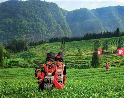 四川省小涼山地區(qū)的樂山市馬邊彝族自治縣福來村,身著傳統(tǒng)彝族服飾的工作人員用手機直播采茶(2022 年 4月 27 日攝)唐文豪攝 / 本刊