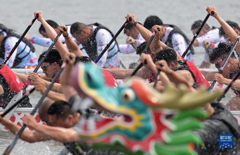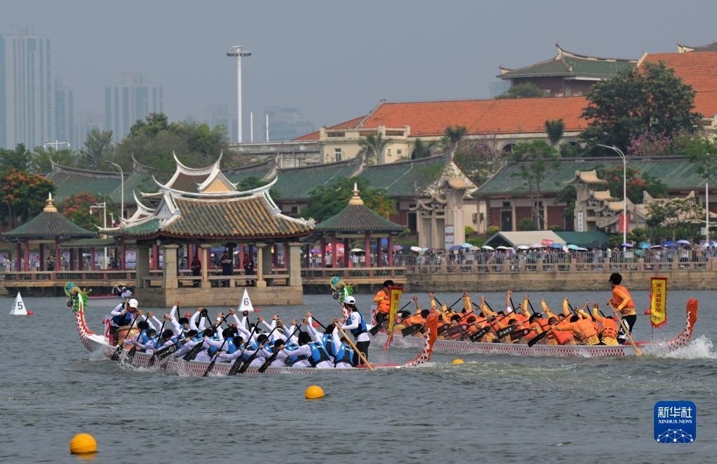 6月3日,在福建廈門集美龍舟池,來自海峽兩岸的龍舟隊(duì)競渡爭先。