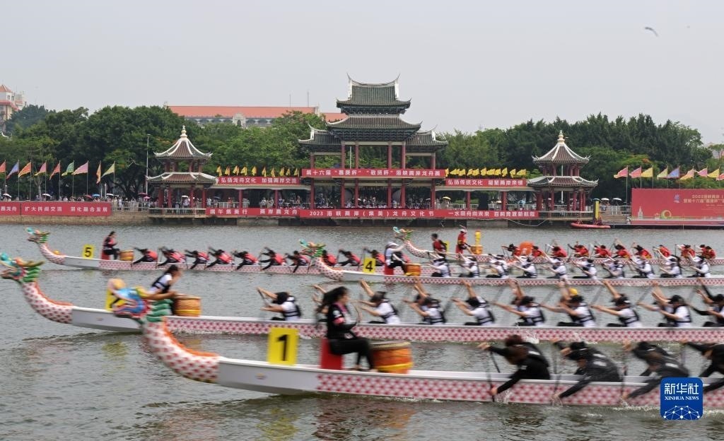 當(dāng)日,2023海峽兩岸(集美)龍舟文化節(jié)暨第十六屆“嘉庚杯”“敬賢杯”海峽兩岸龍舟賽在廈門集美龍舟池啟幕。來自海峽兩岸的47支龍舟隊(duì)伍在競賽中享受龍舟競渡的活力、中華傳統(tǒng)文化的魅力,共有約500名臺(tái)胞參與賽事。