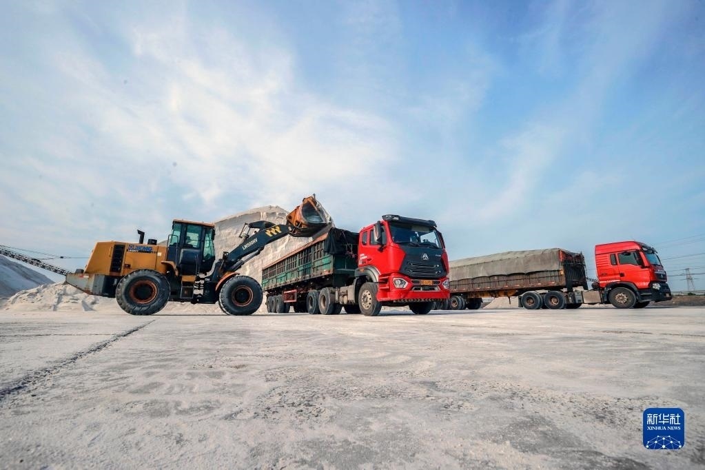 6月4日,工人操作設(shè)備在唐山海港經(jīng)濟(jì)開(kāi)發(fā)區(qū)長(zhǎng)蘆大清河鹽場(chǎng)將海鹽裝車(chē),準(zhǔn)備外運(yùn)。