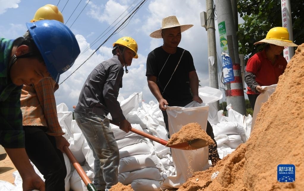 6月11日,在廣西合浦縣白沙鎮(zhèn),人們在裝沙子準備修復遭洪水損毀的堤壩。   新華社記者 陸波岸 攝