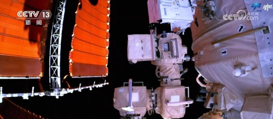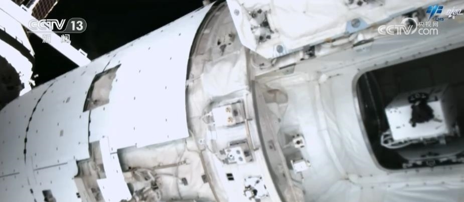 這是3位航天員正在夢(mèng)天實(shí)驗(yàn)艙進(jìn)行空間輻射生物學(xué)暴露實(shí)驗(yàn)裝置出艙工作,航天員將載荷安裝到載荷轉(zhuǎn)移機(jī)構(gòu)。載荷出艙前,航天員在反復(fù)仔細(xì)檢查,隨后,關(guān)閉夢(mèng)天實(shí)驗(yàn)艙貨物氣閘艙艙門。通過該裝置開展空間粒子輻射等環(huán)境要素,對(duì)樣本材料生物學(xué)效應(yīng)的研究,為科學(xué)實(shí)驗(yàn)生物樣品提供生命保障。