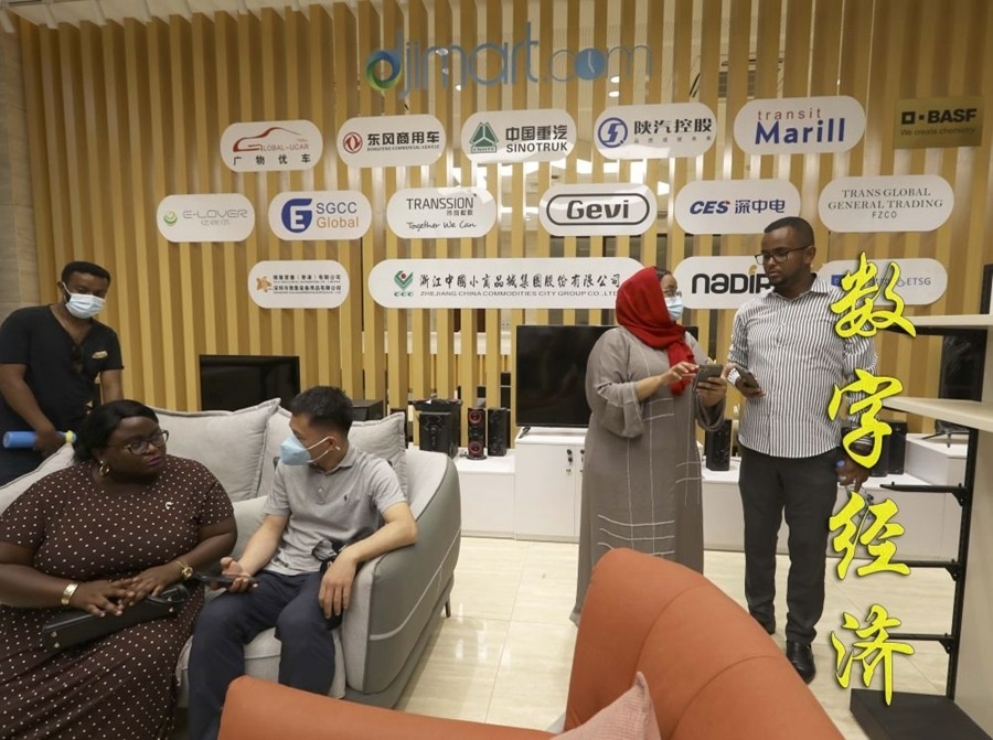 烏干達(dá)青年企業(yè)家迪莉婭(前左)在吉布提國際自貿(mào)區(qū)跨境電商平臺展示區(qū)與中方人員交流(2022年9月14日攝)。
