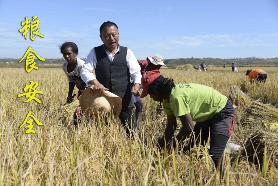 在馬達(dá)加斯加首都塔那那利佛附近的馬義奇鎮(zhèn),中國雜交水稻技術(shù)專家胡月舫(左二)在中國國家雜交水稻工程技術(shù)研究中心非洲分中心的試驗田里和當(dāng)?shù)剞r(nóng)民交流(2023年5月12日攝)。目前,中國雜交水稻在馬達(dá)加斯加累計推廣面積已達(dá)5萬多公頃,平均每公頃產(chǎn)量可達(dá)7.5噸左右。馬達(dá)加斯加距離實現(xiàn)糧食自給自足的目標(biāo)邁近了一大步。