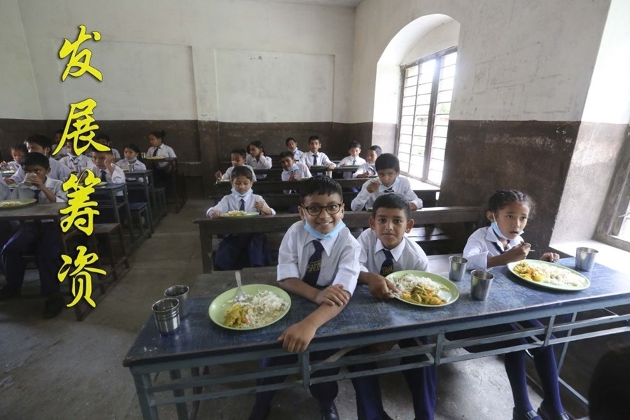 在尼泊爾加德滿都,學(xué)生們參加微笑兒童項目啟動儀式并就餐(2022年7月11日攝)。由“全球發(fā)展和南南合作基金”支持的微笑兒童項目惠及約3600名尼泊爾學(xué)生,解決學(xué)生就餐問題。