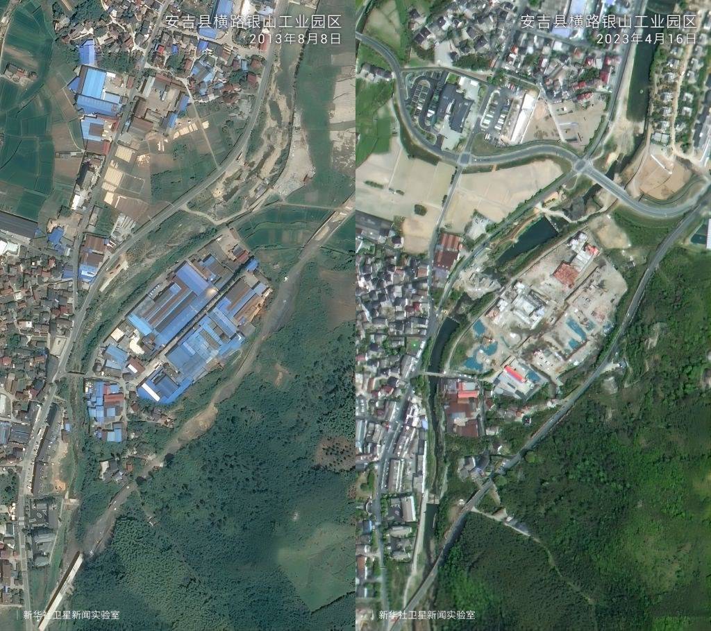 在“綠水青山就是金山銀山”理念指引下,20年來浙江省安吉縣余村完成了從水泥廠、礦山遍布到“人在余村走、就是畫中游”的精彩蝶變。衛(wèi)星云圖中的大片灰色如今已被滿目綠色所覆蓋,從“工業(yè)飛鳥”到“生態(tài)田園”,余村百姓看到了美景,富足了精神。