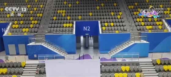 總臺央視記者 任梅梅:現(xiàn)在我們就來到了手球館室外的二層平臺,進入了“水?!钡膬?nèi)部,這一條條垂著的“水幔”其實不僅僅是裝飾品,更有著實際的作用,它們就像百葉窗一樣,能夠起到隔熱的效果,另外還可以減少眩光,提高室內(nèi)視覺的舒適度。