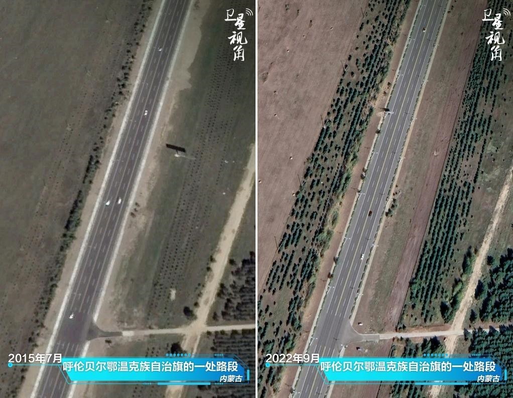 ↑2022年與2015年相比,內蒙古呼倫貝爾鄂溫克族自治旗一處道路兩側樹木顯著增多。