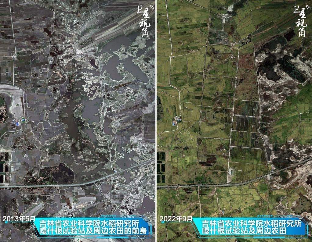 ↑2022年與2013年相比,經(jīng)過治理,吉林省白城市鎮(zhèn)賚縣嘎什根鄉(xiāng)大片鹽堿地變良田。