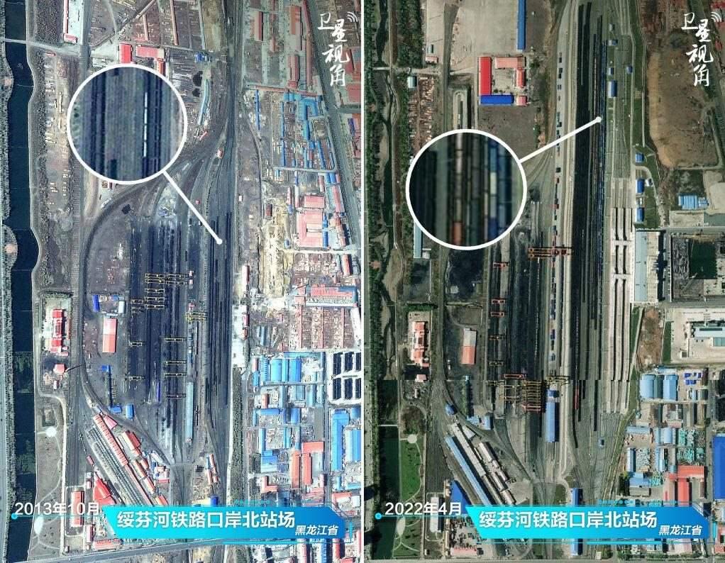 ↑2022年與2013年相比,綏芬河鐵路口岸貨運列車增多,反映外貿活力增強。