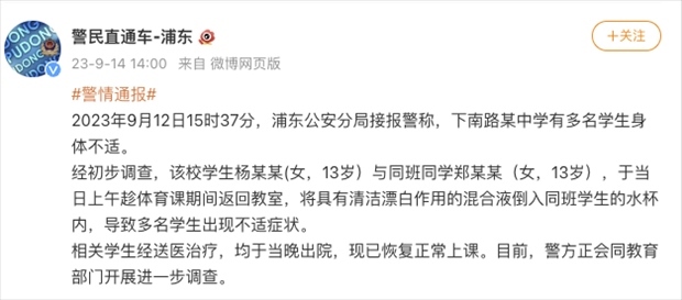 ·上海警方通報(bào)“中學(xué)生在校投放不明物質(zhì)致同學(xué)飲用后送醫(yī)”。