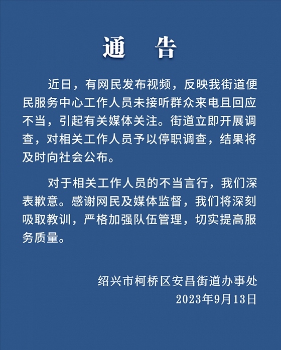 ·浙江紹興有市民發(fā)視頻稱(chēng),打不通安昌便民中心電話,來(lái)到現(xiàn)場(chǎng)發(fā)現(xiàn)工作人員都在聊天,吐槽電話是擺設(shè)。官方通報(bào):相關(guān)工作人員停職調(diào)查。