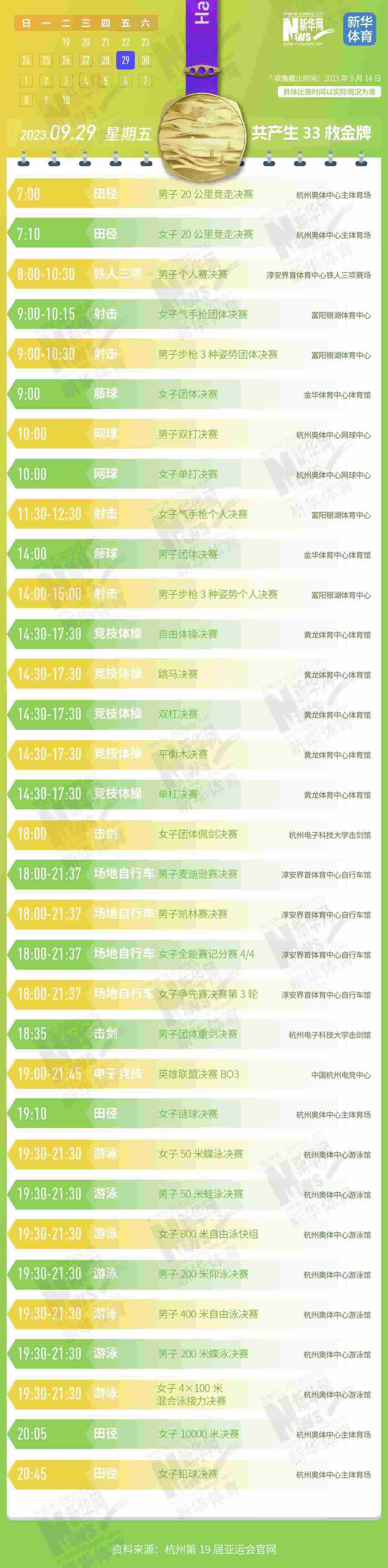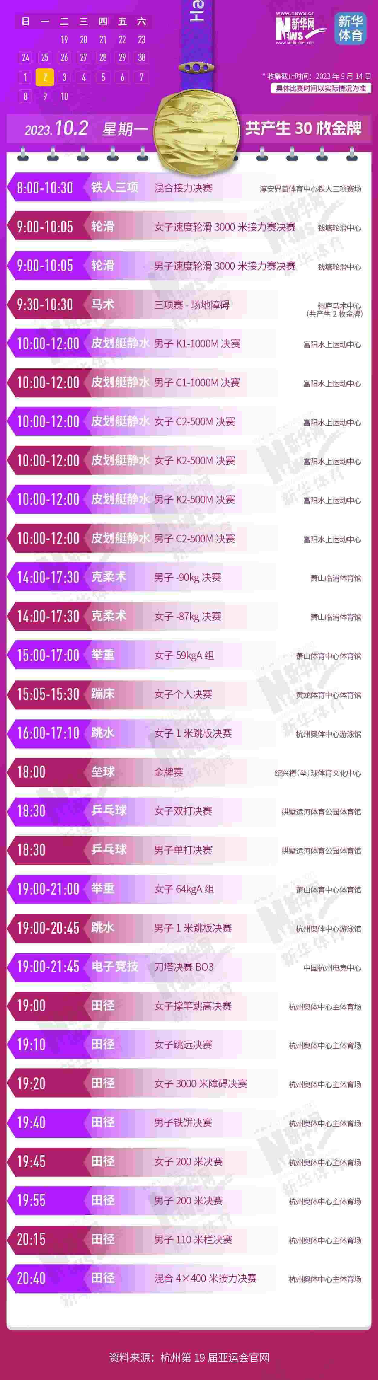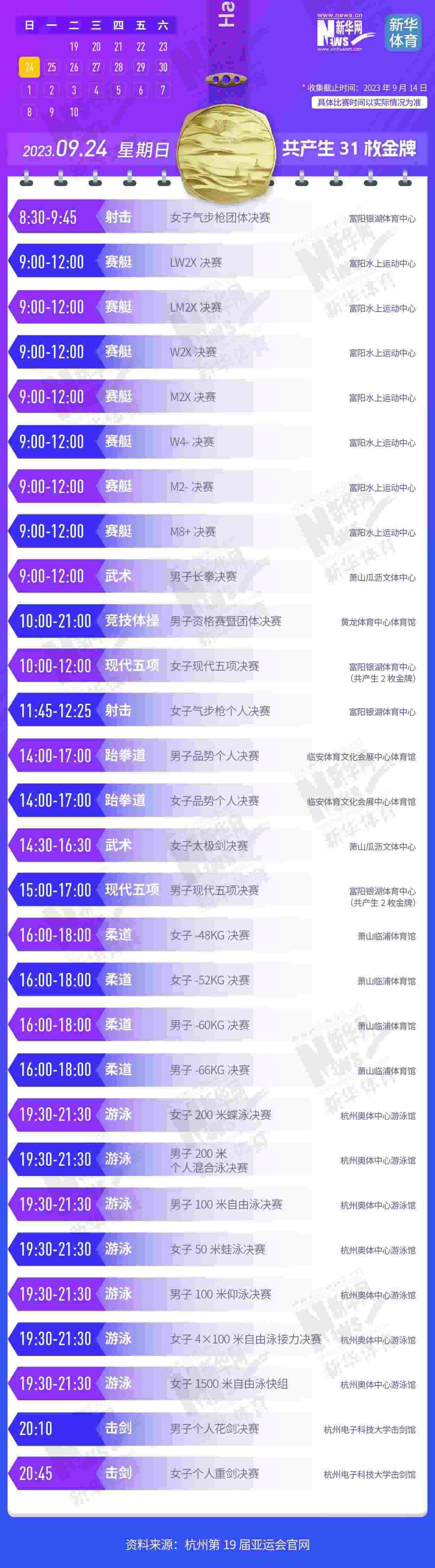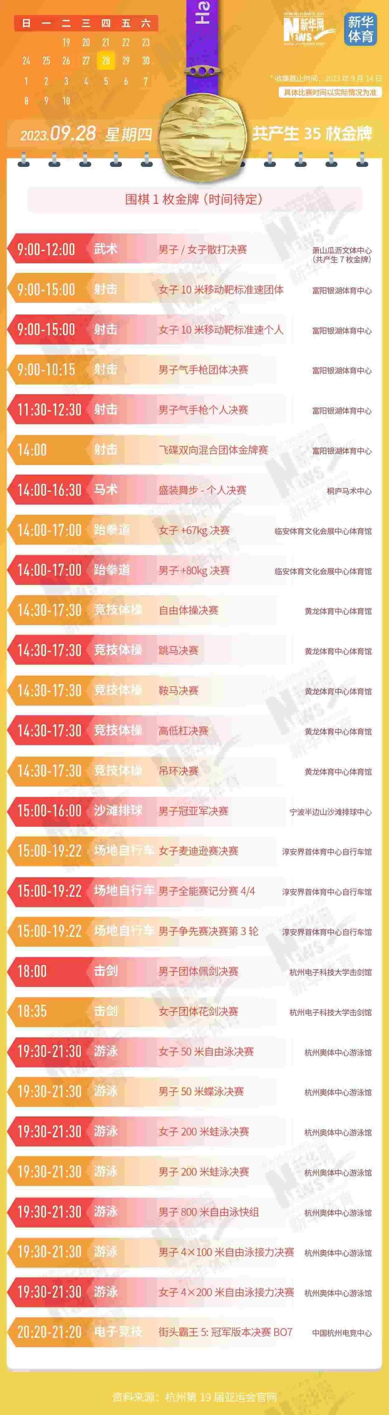 杭州第19屆亞運(yùn)會(huì)即將開(kāi)幕。本屆亞運(yùn)會(huì)將產(chǎn)生481枚金牌,快收藏這份金牌賽事日歷,助你精準(zhǔn)觀賽!