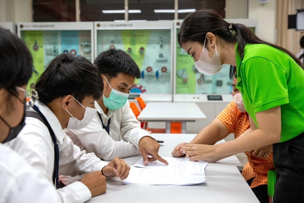 3月14日,在泰國大城府大城技術(shù)學院魯班工坊,教師(右一)給學生上課。新華社記者 王騰 攝