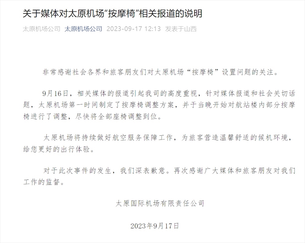·太原機(jī)場回應(yīng)“部分登機(jī)口全是按摩椅”:將在19日調(diào)整完畢。