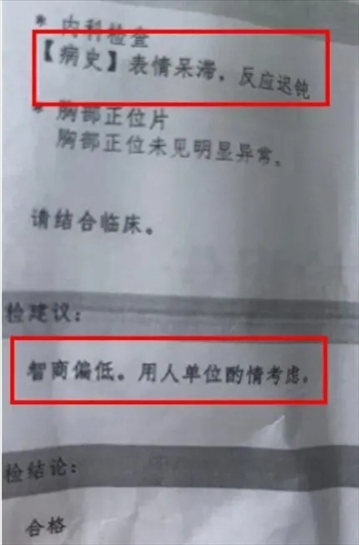 ·江蘇一醫(yī)院體檢報(bào)告上寫“智商偏低,用人單位酌情考慮”?涉事醫(yī)院回應(yīng):屬實(shí),主檢醫(yī)生已被停職。