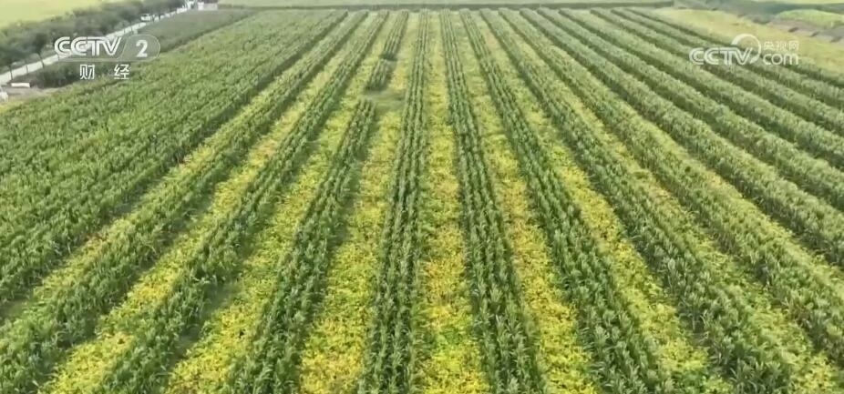 除了高密度種植,今年她家還有220畝采取了大豆玉米帶狀復合種植。你看對面的這片田就是,四行玉米間隔著六行大豆,這是按照當?shù)剞r(nóng)機的大小和寬度調(diào)整的種植寬度,玉米喜光大豆耐蔭,一高一矮套種互不影響,同時又能更加土地的利用率。