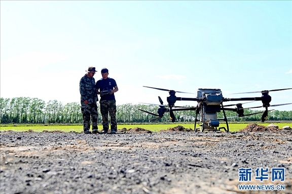北大荒集團(tuán)二九〇農(nóng)場(chǎng)有限公司農(nóng)技人員正指導(dǎo)種植戶使用無(wú)人機(jī)。