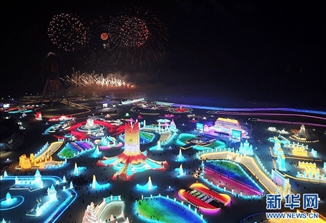 焰火在冰雪大世界園區(qū)上空綻放(無(wú)人機(jī)照片)。