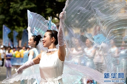 在哈爾濱市中央大街上,人們參加巡游慶?;顒?dòng)。