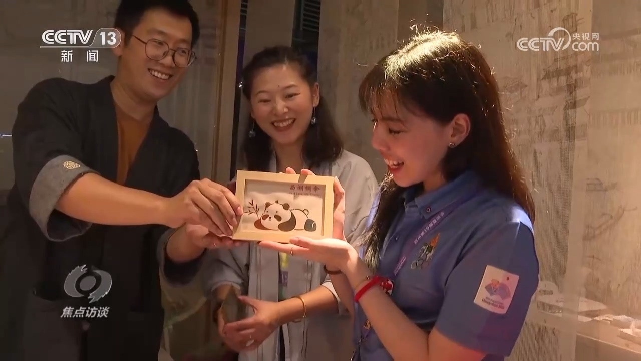 村里的文化市集里同樣熱鬧非凡,竹編、剪紙、皮影戲……每一個(gè)展位面前都圍著不少外國(guó)運(yùn)動(dòng)員。來自泰國(guó)的擊劍運(yùn)動(dòng)員正在體驗(yàn)綢傘刷花。在刷子涂上顏料,再和絲網(wǎng)進(jìn)行充分摩擦,顏料就會(huì)透過刻板平鋪在畫布上,精美的熊貓圖案就做出來了。當(dāng)?shù)弥@是綢傘上的技術(shù)時(shí),運(yùn)動(dòng)員班提達(dá)十分驚訝。